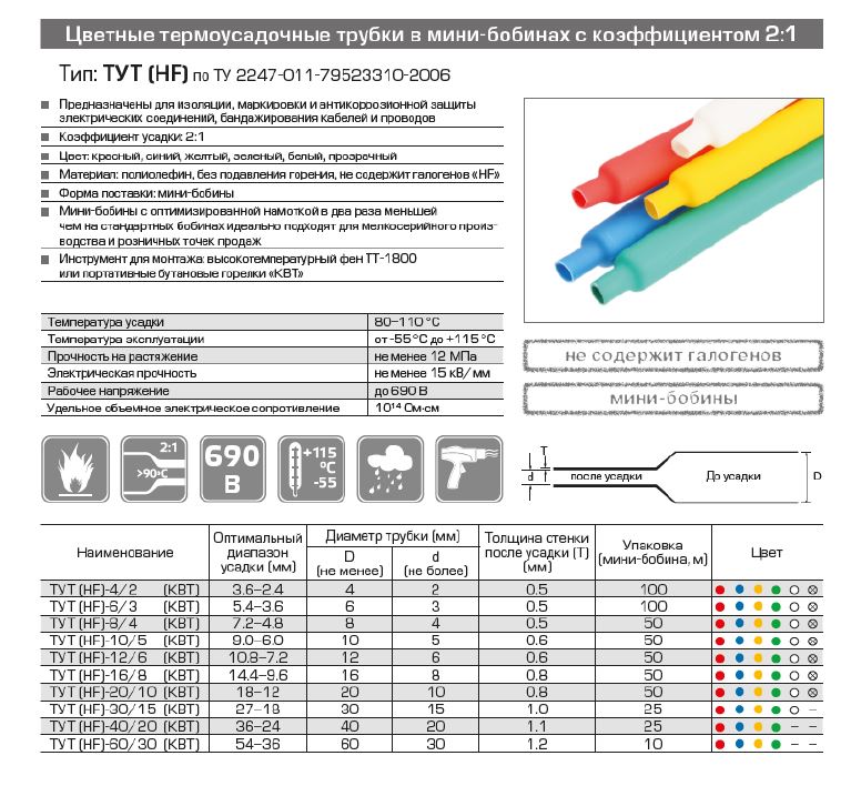 Трубка термоусадочная ТУТ (HF)-4/2 син (Трубка термоусадочная ТУТ (HF)-4/2 син) — Термоусадочная трубка в метровой нарезке с коэффициентом усадки 2:1.