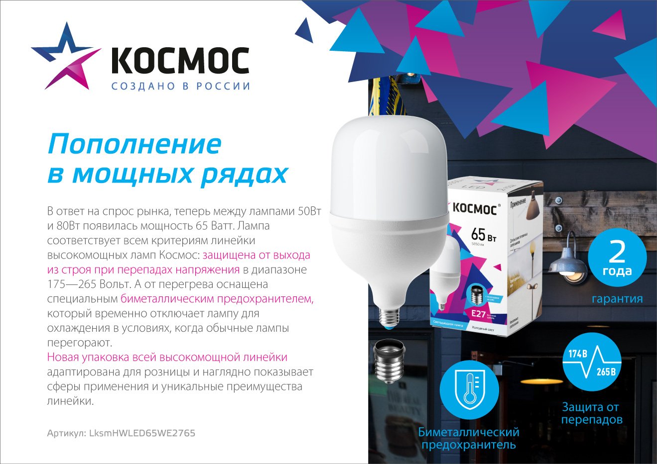 Купить Лампа светодиодная высокомощная HWLED 65Вт 6500К E27 220В КОСМОС LksmHWLED65WE2765 оптом или в розницу в Москве, доставка по России. Цена от 386,99 руб.. Условия оплаты и доставки уточняйте у менеджеров.