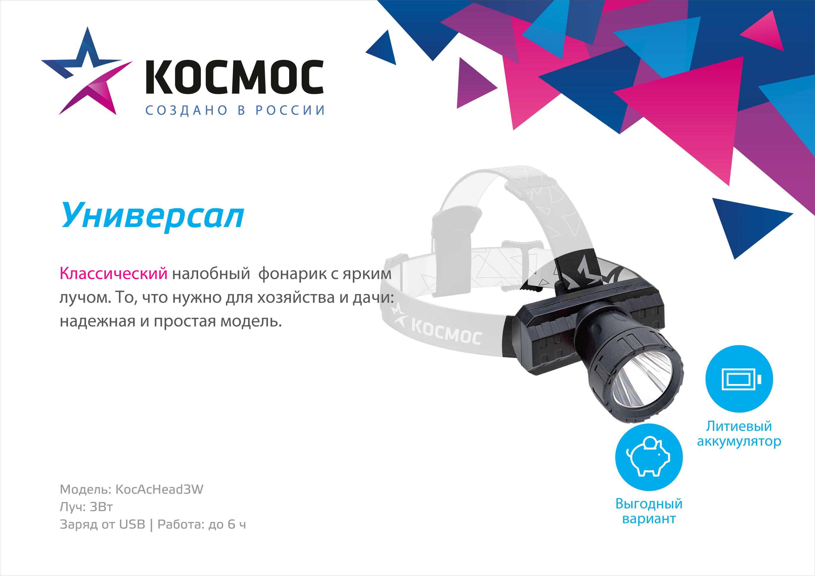 Фонарь аккумуляторный налобный XPE 3Вт литиевый аккум. 0.8А.ч ЗУ Micro USB шнур (в компл.) KocAcHead3W (Фонарь аккумуляторный налобный XPE 3Вт литиевый аккум. 0.8А.ч ЗУ Micro USB шнур (в компл.) KocAcHead3W) — Электронный компонент.
