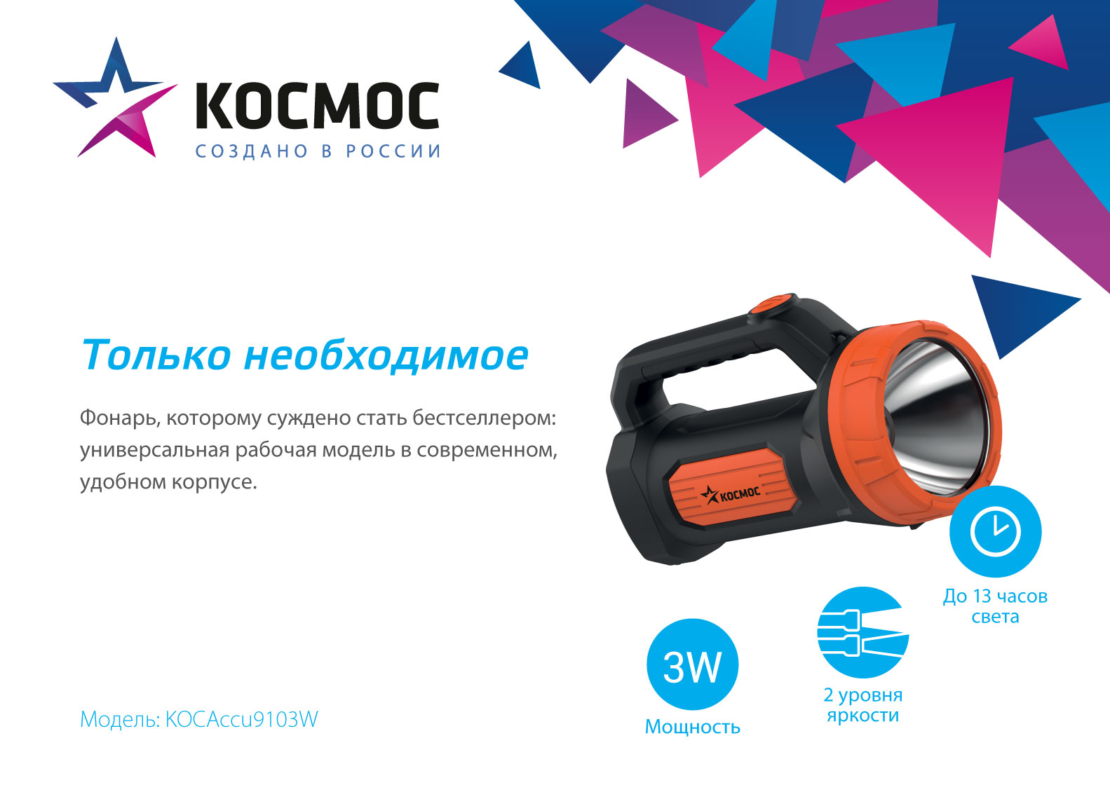 Купить Фонарь аккумуляторный 3Вт 2 режима свинцово-кислотный аккум. 4В 1.2А.ч шнур для подзарядки (в компл.) KOCAccu9103W оптом или в розницу в Москве, доставка по России.