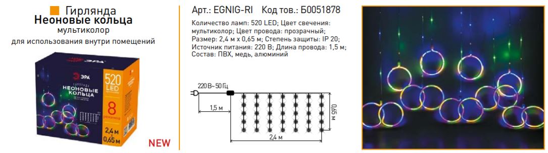 Светодиодная новогодняя гирлянда ЕGNIG - RI занавес Неоновые кольца 8 режимов 2,4*0,65 м мультиколор IP20 Б0051878 (Светодиодная новогодняя гирлянда ЕGNIG - RI занавес Неоновые кольца 8 режимов 2,4*0,65 м мультиколор IP20 Б0051878) — Электронный компонент.