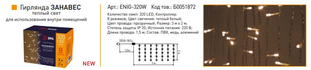 Светодиодная новогодняя гирлянда ЕNIG - 320W Занавес 8 режимов 3*2 м теплый белый 320 LED IP20 220 V Б0051872 (Светодиодная новогодняя гирлянда ЕNIG - 320W Занавес 8 режимов 3*2 м теплый белый 320 LED IP20 220 V Б0051872) — Электронный компонент.