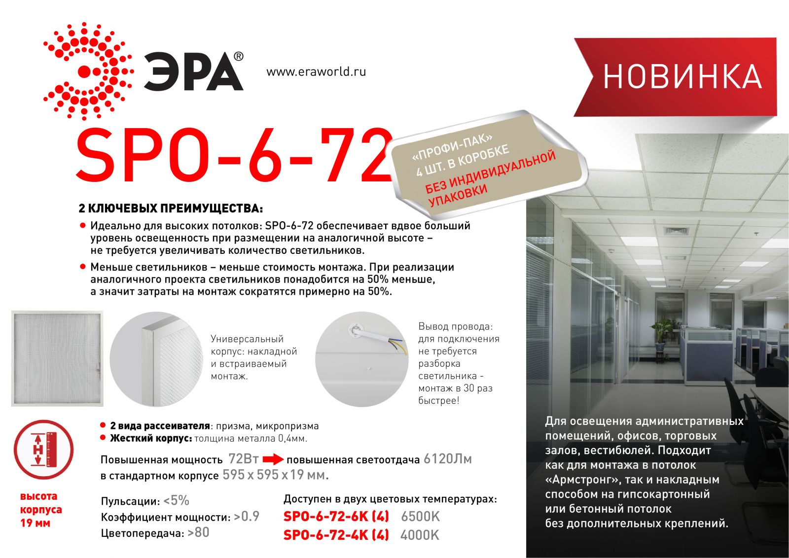 Купить Светильник светодиодный SPO-6-72-4K-P 72Вт 4000К 6000Лм IP40 595х595х19 призма с проводом Б0041861 оптом или в розницу в Москве, доставка по России.