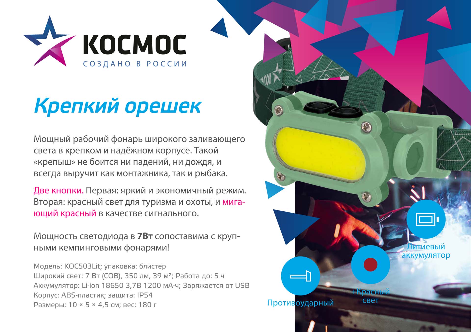 Товар: Фонарь аккумуляторный налобный 7Вт COB LED+красн. Li-ion 18650 1200мА.ч корпус ABS-пластик USB-шнур type C регулируемый эласт. ремешок KOC503Lit (ID: 758211)