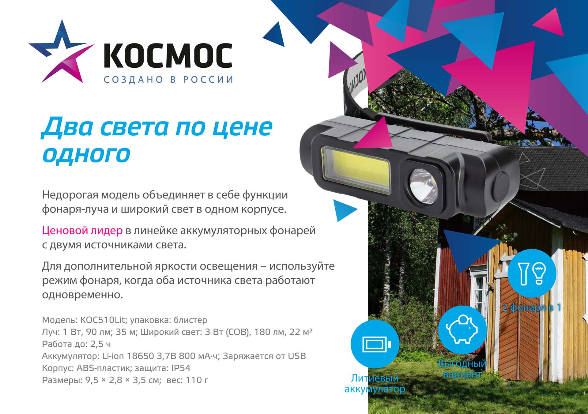 Купить Фонарь аккумуляторный налобный 1Вт LED+3Вт COB LED Li-ion 18650 800мА.ч корпус ABS-пластик USB-шнур регулируемый эласт. ремешок KOC510Lit оптом или в розницу в Москве, доставка по России. Цена от 357,60 руб.. Условия оплаты и доставки уточняйте у менеджеров.