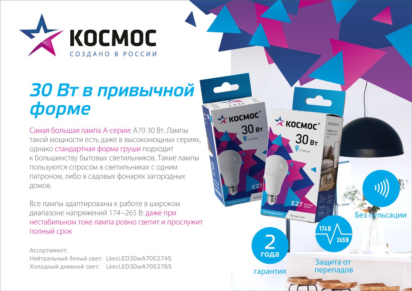 Купить Лампа светодиодная А70 30Вт 4500К Е27 174-265В КОСМОС LkecLED30wA70E2745 оптом или в розницу в Москве, доставка по России. Цена от 131,03 руб.. Условия оплаты и доставки уточняйте у менеджеров.