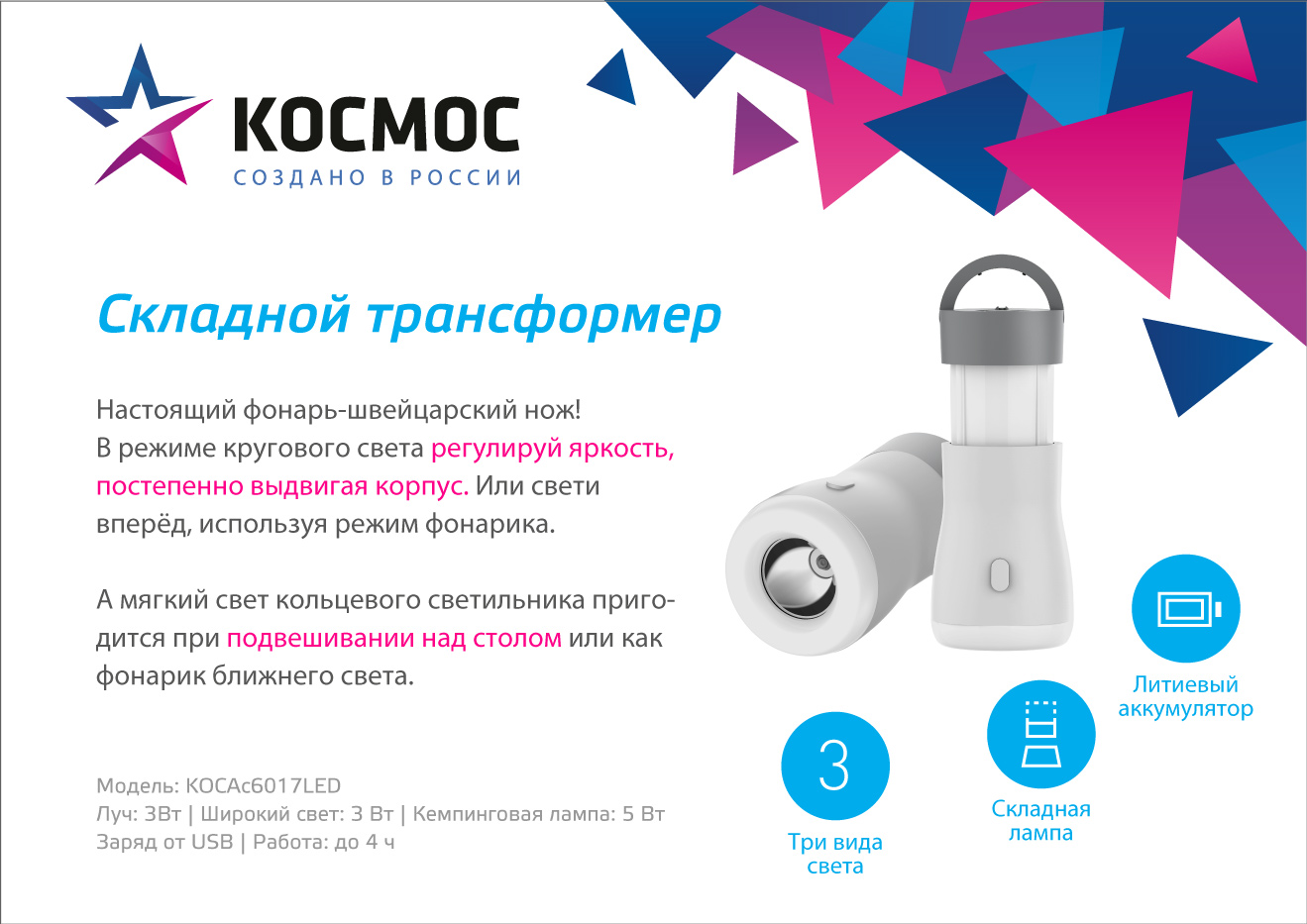 Купить Фонарь-светильник аккумуляторный 3Вт + режим кемпинг 5Вт литиевый аккум. 3.7В 1.2А.ч KOCAc6017LED Космос оптом в Москве